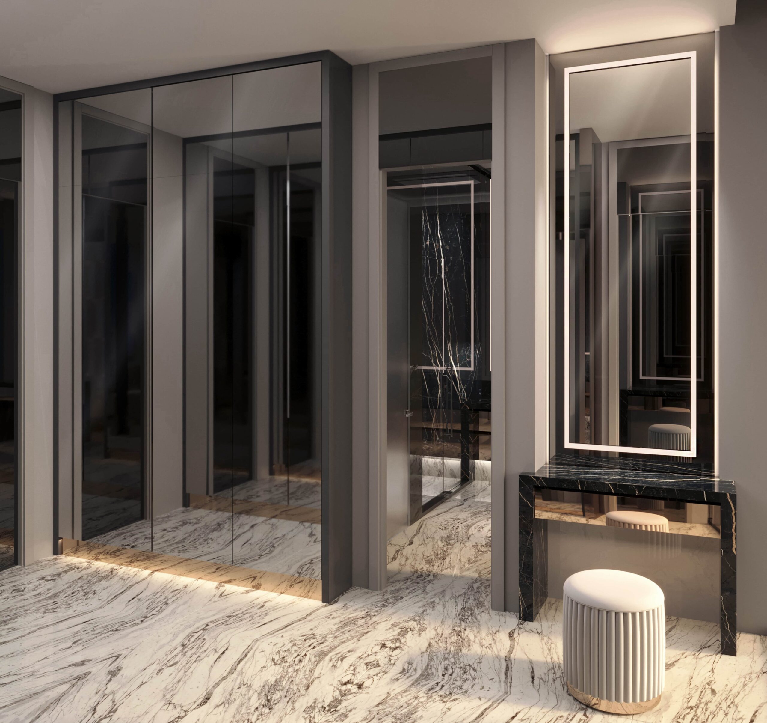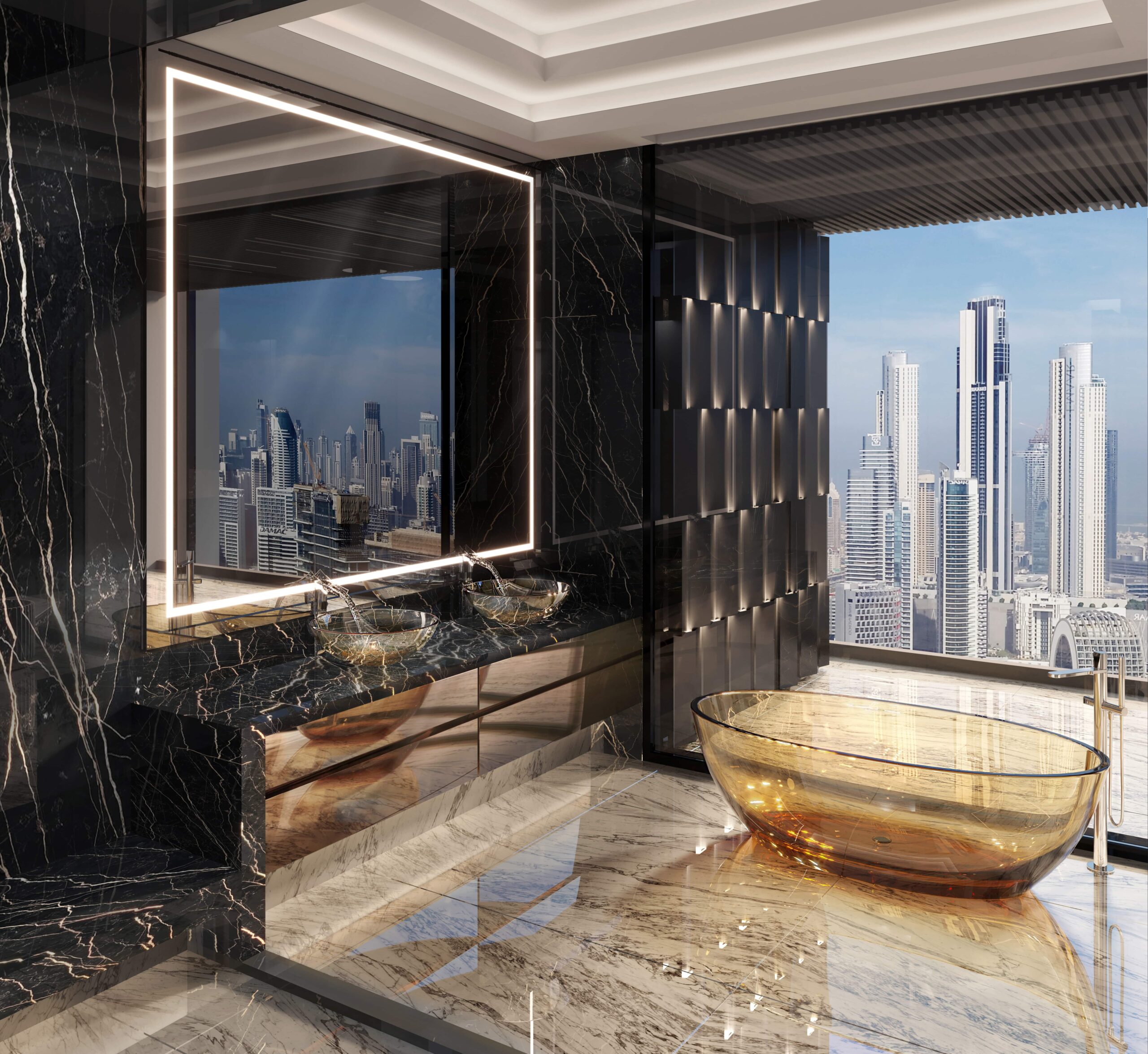 • Interiors are finished with natural marble, golden accents, crystalline glass, and sophisticated textures composed into a visually spectacular harmony.